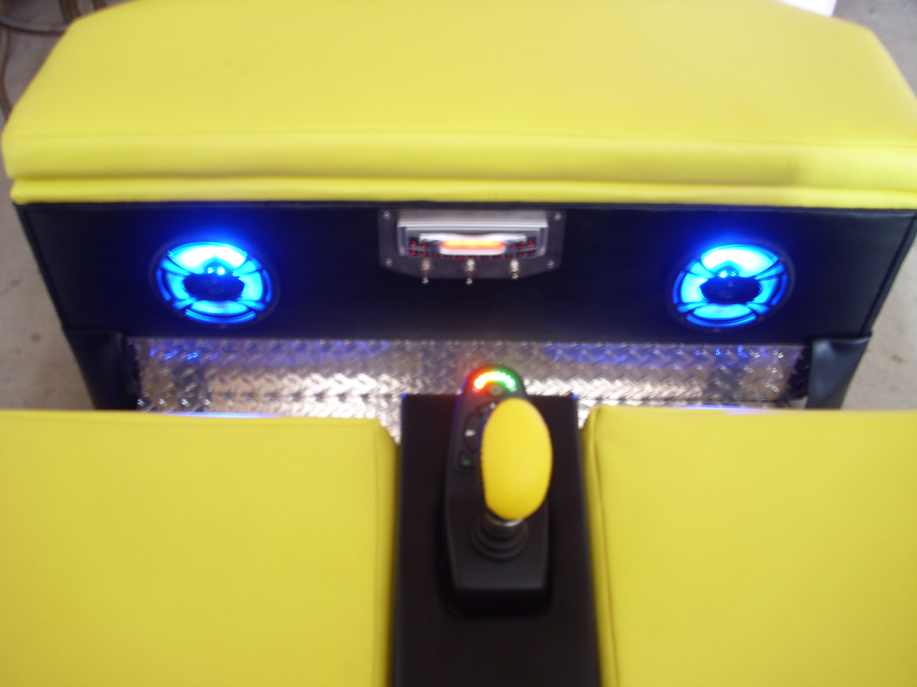 Is yellow and black your thing?? It sure is mine. This new model features a silky smooth drive system that is unbelievable. Eye popping yellow and black accents make this machine unforgettable. A thumpin' stereo system coupled with Lighted speakers and accent the diamond plate floor. Custom embroidery brings the colors together in a way not seen before. A unique shaped footstool brings the whole chair together. We will post some photos soon as the project is coming to a close.